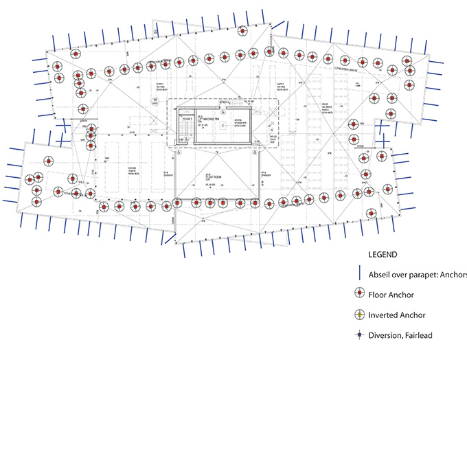 This particular building includes 77 floor set anchors with associated parapet guides, 35 Lateral restraints (at the half-abseil mark), and 4 inverted anchors to be used to access under-hangs. Builders, Architects, and finally the owner's corporation have been very satisfied with the result.